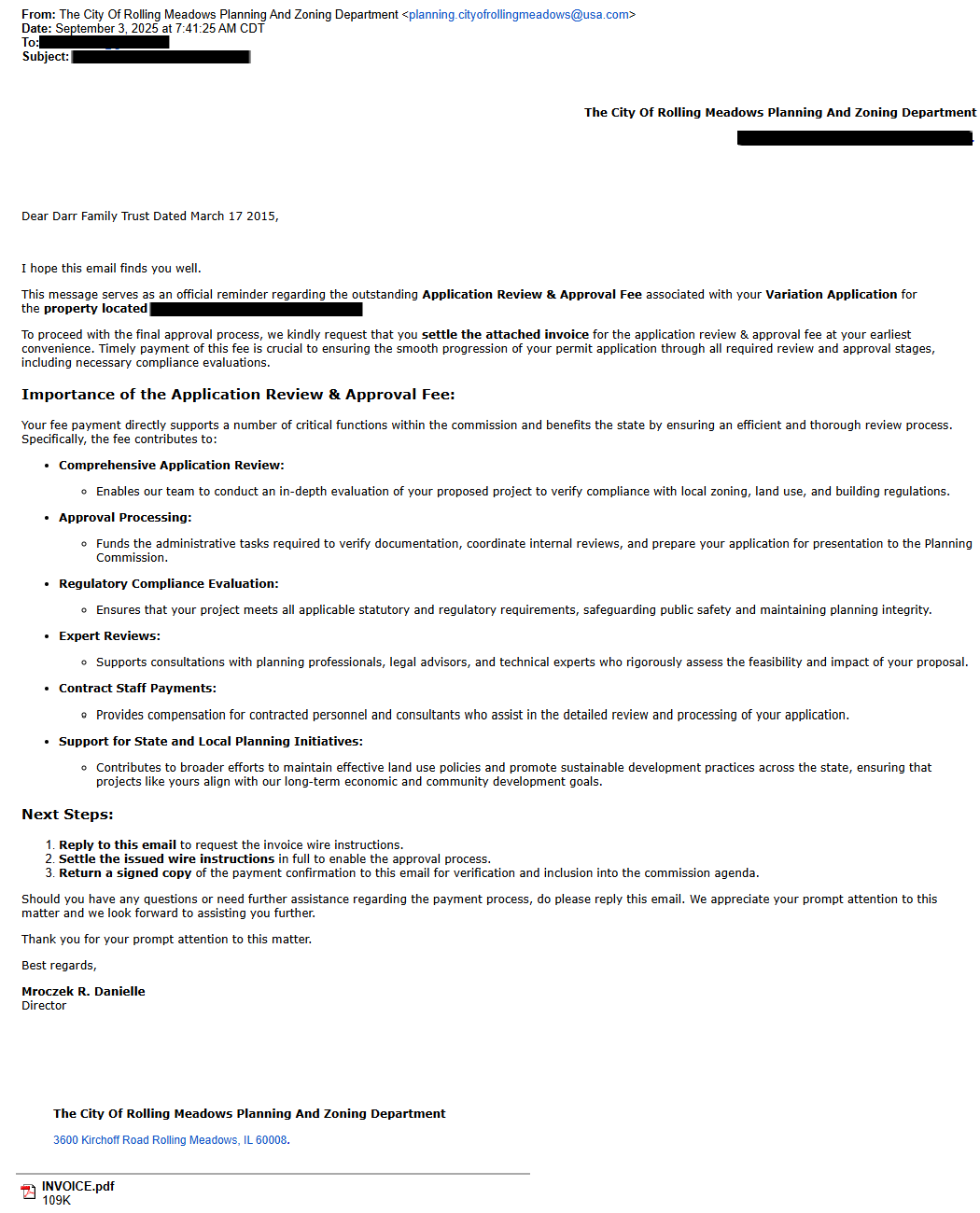 In this case, the phishing attempt was directed at a zoning applicant. We recommend reminding your applicants and colleagues to verify the sender’s email address carefully and to be cautious with unexpected attachments or requests.